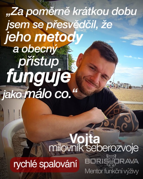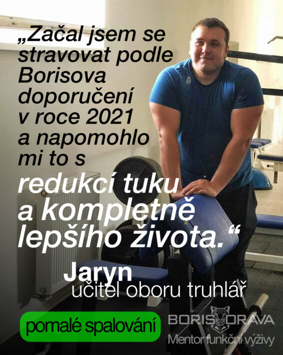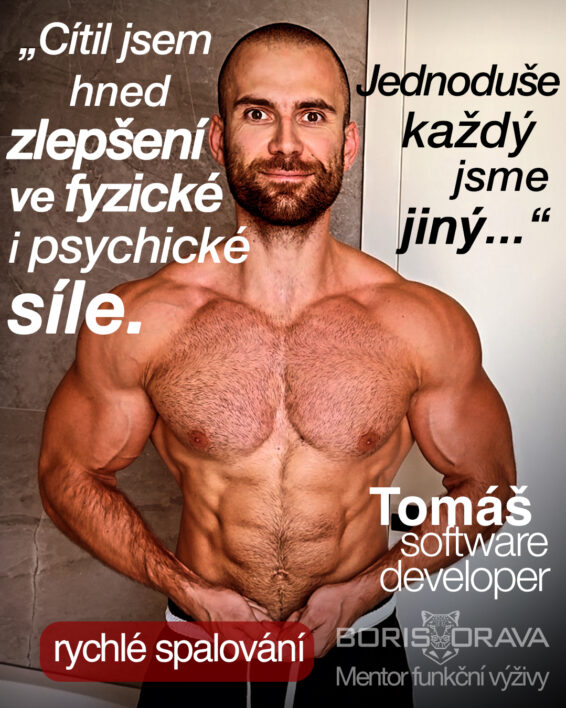 Spolupráce s Borisem mě naučila to, že nemá smysl v sobě potlačovat svoji přirozenost. Vždycky jsem měl radši krupičnou kaši než hovězí steak. Začal jsem se stravovat podle Borisova doporučení v roce 2021 a napomohlo mi to s redukcí tuku a kompletně lepšího života. Přestal jsem se cpát tučným masem s málem sacharidů. A zjistil jsem, že skutečně nejsem stavěný na silový sport. A rozhodně né na jídlo 6x za den. Dnes baštím 3x denně a cvičím podle nálady. Váha jde pořád dolů a hlavně mám čas na sebe a svoji rodinu, což je pro mě nejvíc. Myslím si, že i Borisovo potvrzení mého metabolického typu mě přimělo změnit práci. Přestal jsem pracovat jen pro peníze a začal jsem učit na Středním Odborném učilišti jako učitel oboru Truhlář. Děkuji Borisi.